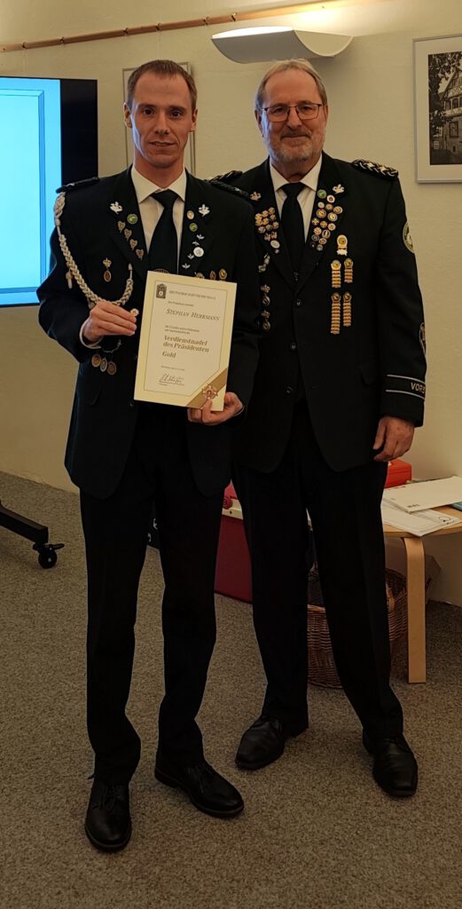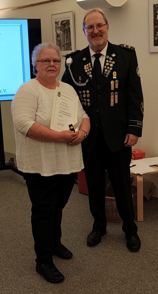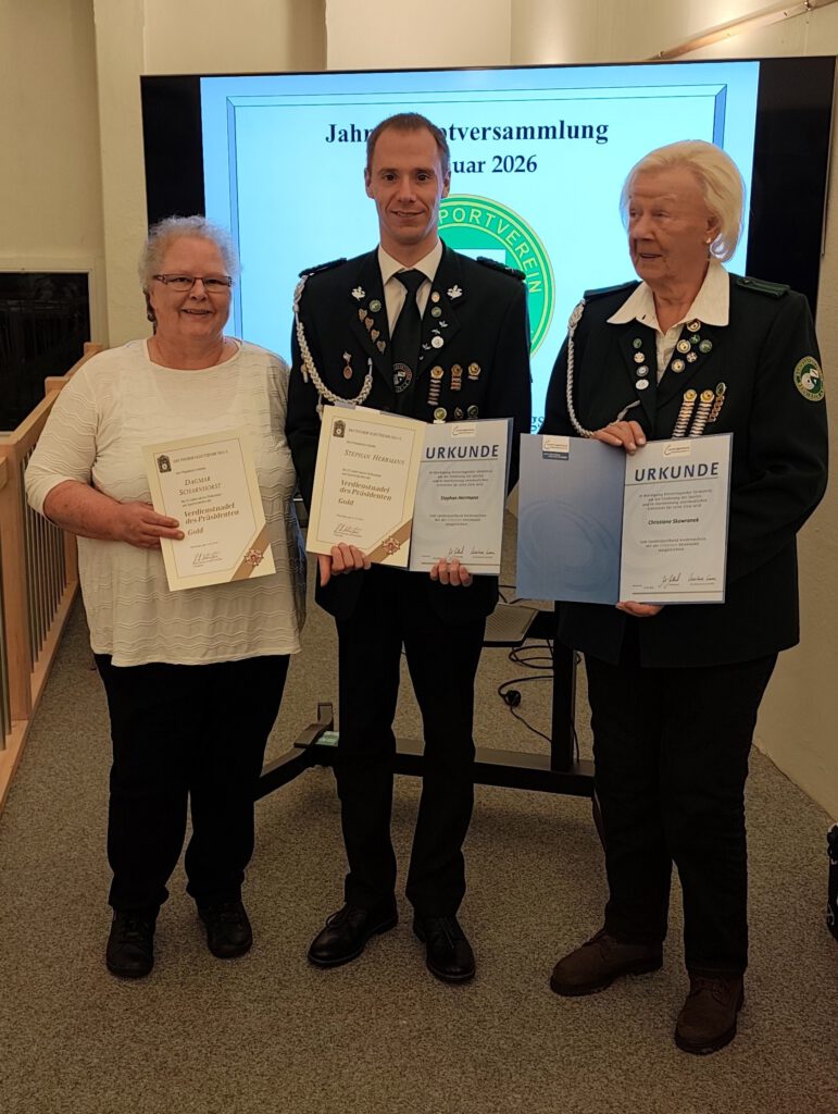 Anschließen überreichte Udo Herrmann Dagmar Scharnhorst und Stephan Herrmann die „Ehrennadel des Präsidenten“ des DSB in Gold für 25 Jahre aktive Beteiligung am Schießsport.